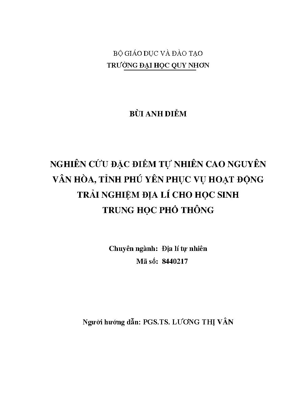 Nghiên cứu đặc điểm tự nhiên cao nguyên Vân Hòa, tỉnh Phú Yên phục vụ hoạt động trải nghiệm Địa lí cho học sinh trung học phổ thông
