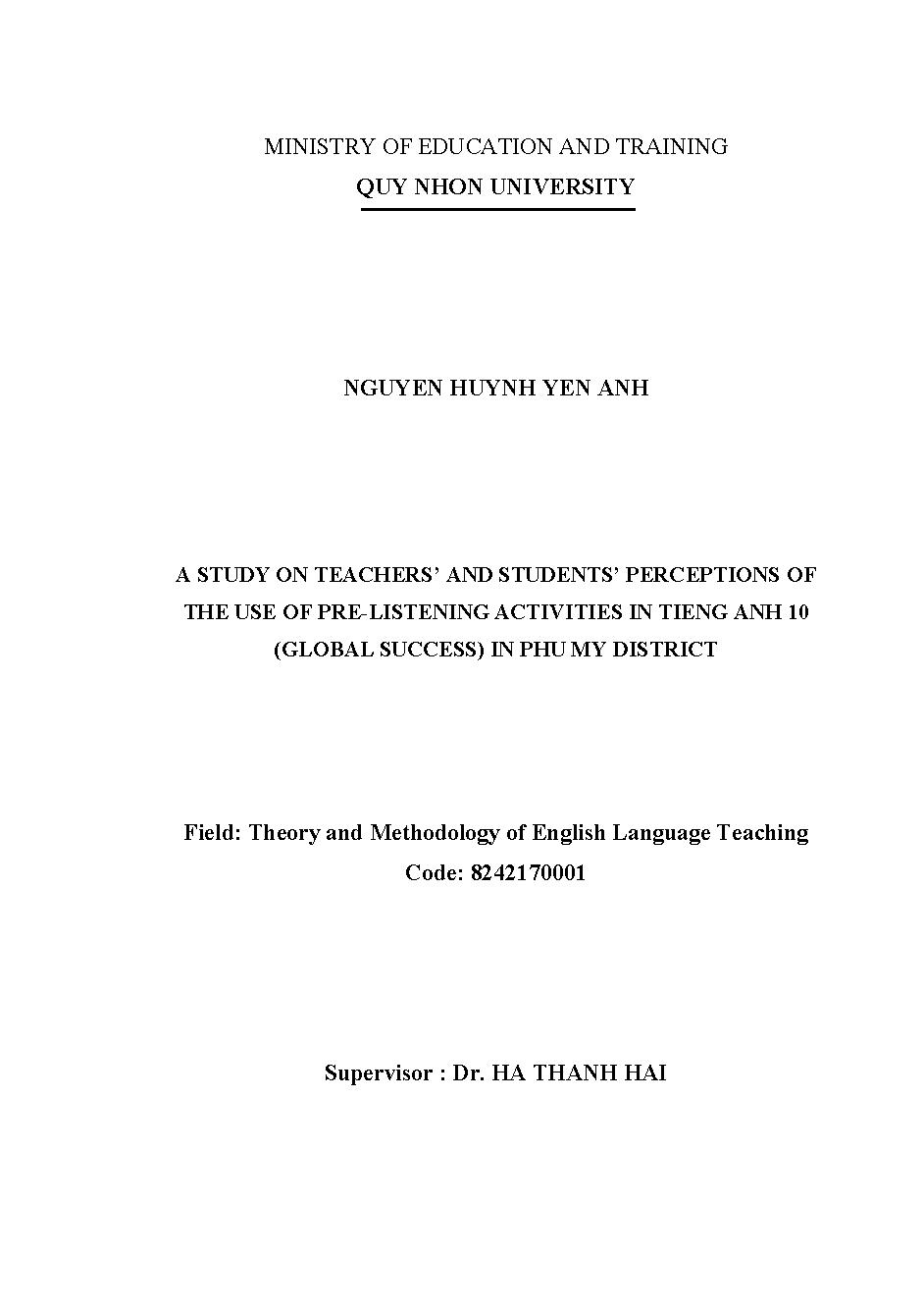 A study on teachers' and students' perceptions of the use of pre-learning activities in tieng anh 10 (global success) in Phu My district = Nhận thức của giáo viên và học sinh về việc sử dụng hoạt động pre-learning trong giảng dạy tiếng Anh 10 (global success) ở các trường THPT trên địa bàn huyện Phù Mỹ