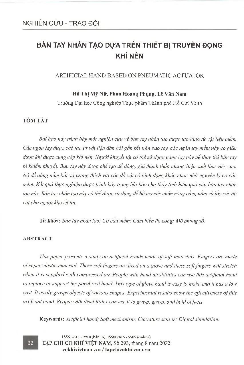 Bàn tay nhân tạo dựa trên thiết bị truyền động khí nén = Artificial hand based on pneumatic actuator