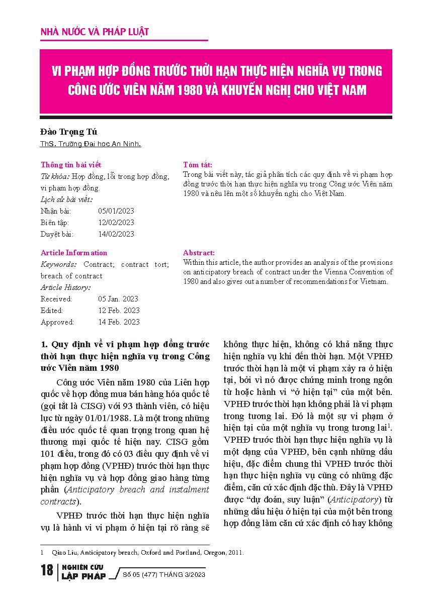 Vi phạm hợp đồng trước thời hạn thực hiện nghĩa vụ trong Công ước Viên năm 1980 và khuyến nghị cho Việt Nam = Breach of contract before the time limit for performance of obligations in the Vienna Convention 1980 and recommendations for Vietnam