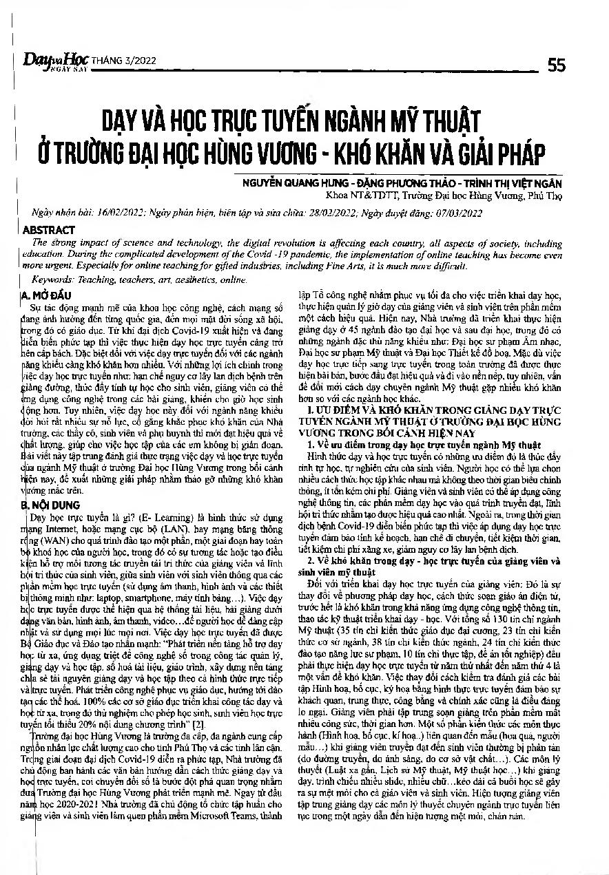 Dạy và học trực tuyến ngành Mỹ thuật ở Trường Đại học Hùng Vương - Khó khăn và giải pháp = Online teaching of Fine Arts at Hung Vuong University, difficulties and solutions