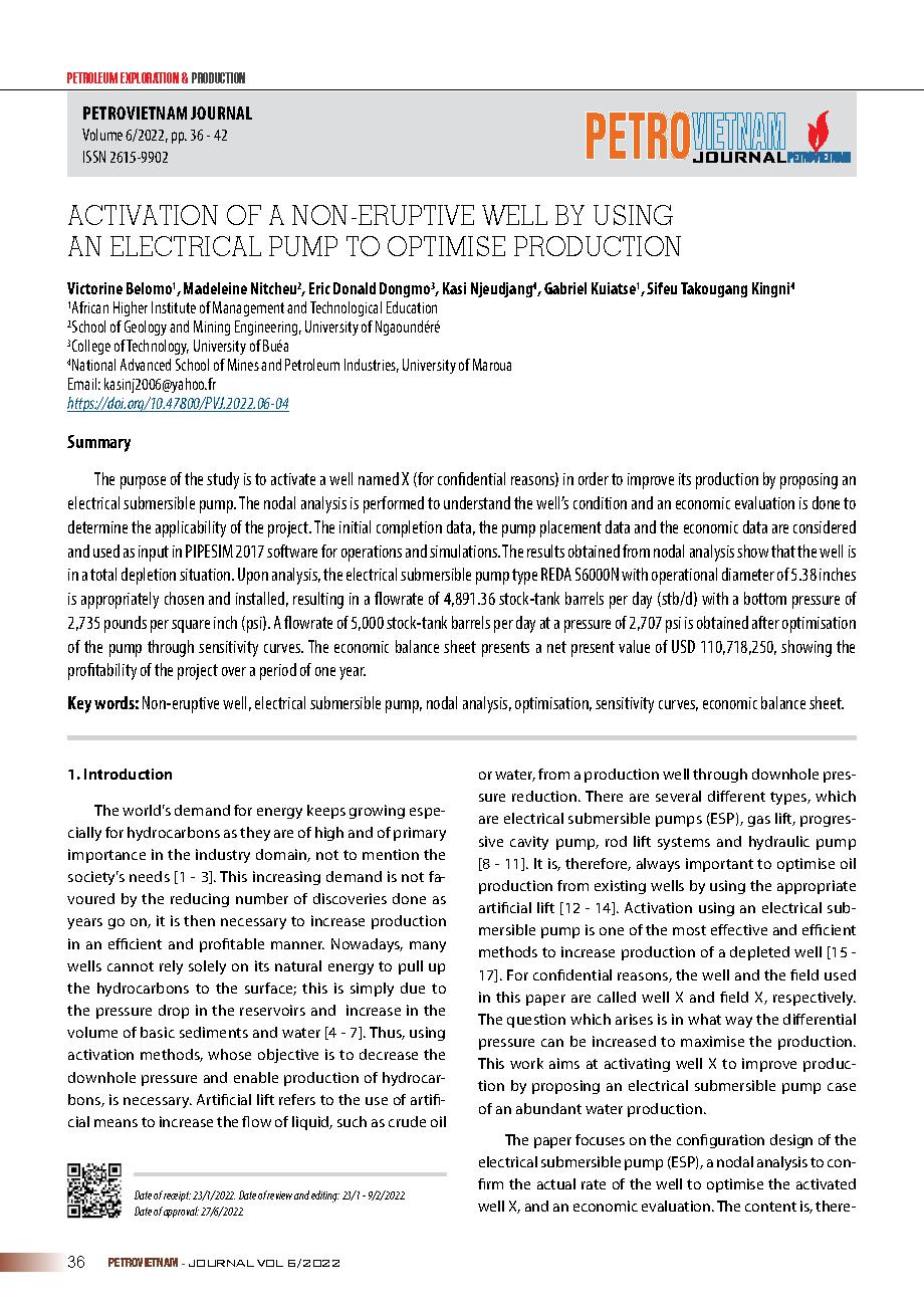 Kích hoạt giếng không phun trào bằng cách sử dụng máy bơm điện để tối ưu hóa sản xuất = Activation of a non-eruptive well by using an electrical pump to optimise production