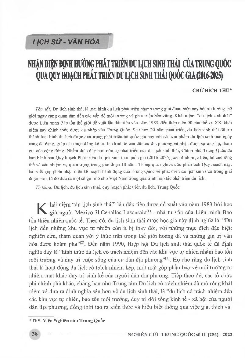 Nhận diện định hướng phát triển du lịch sinh thái của Trung Quốc qua Quy hoạch phát triển du lịch sinh thái quốc gia (2016-2025) = Identifying China's ecotourism development orientation through its National Ecotourism Development Plan (2016-2025)
