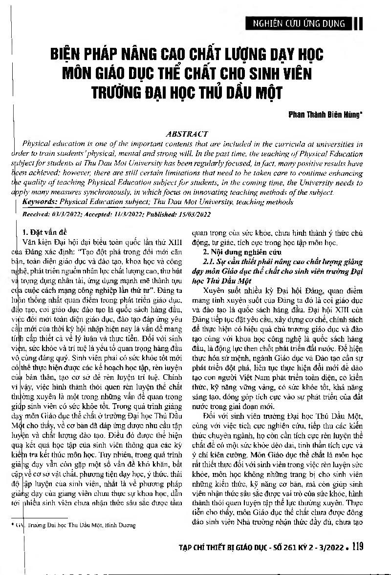 Biện pháp nâng cao chất lượng dạy học môn Giáo dục thể chất cho sinh viên Trường đại học Thủ Dầu Một = Measures of enhancing the quality of teaching Physical Education subject for students at Thu Dau Mot University