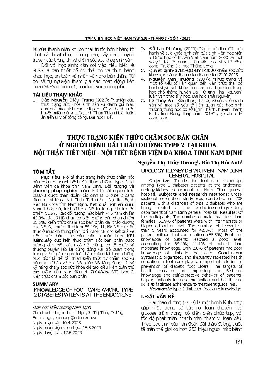 Thực trạng kiến thức chăm sóc bàn chân ở người bệnh đái tháo đường type 2 tại Khoa Nội thận tiết niệu - nội tiết Bệnh viện Đa khoa tỉnh Nam Định = Knowledge of foot care among type 2 diabetes patients at the endocrine-urology-kidney department Nam Dinh ge