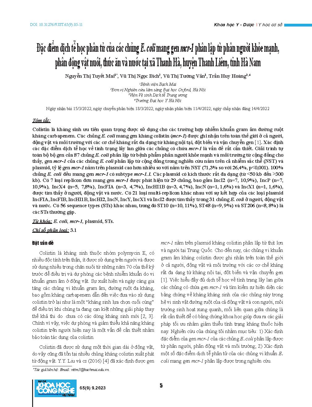 Đặc điểm dịch tễ học phân tử của các chủng E. coli mang gen mcr-1 phân lập từ phân người khỏe mạnh, phân động vật nuôi, thức ăn và nước tại xã Thanh Hà, huyện Thanh Liêm, tỉnh Hà Nam = Molecular epidemiological characteristics of E. coli strains carrying