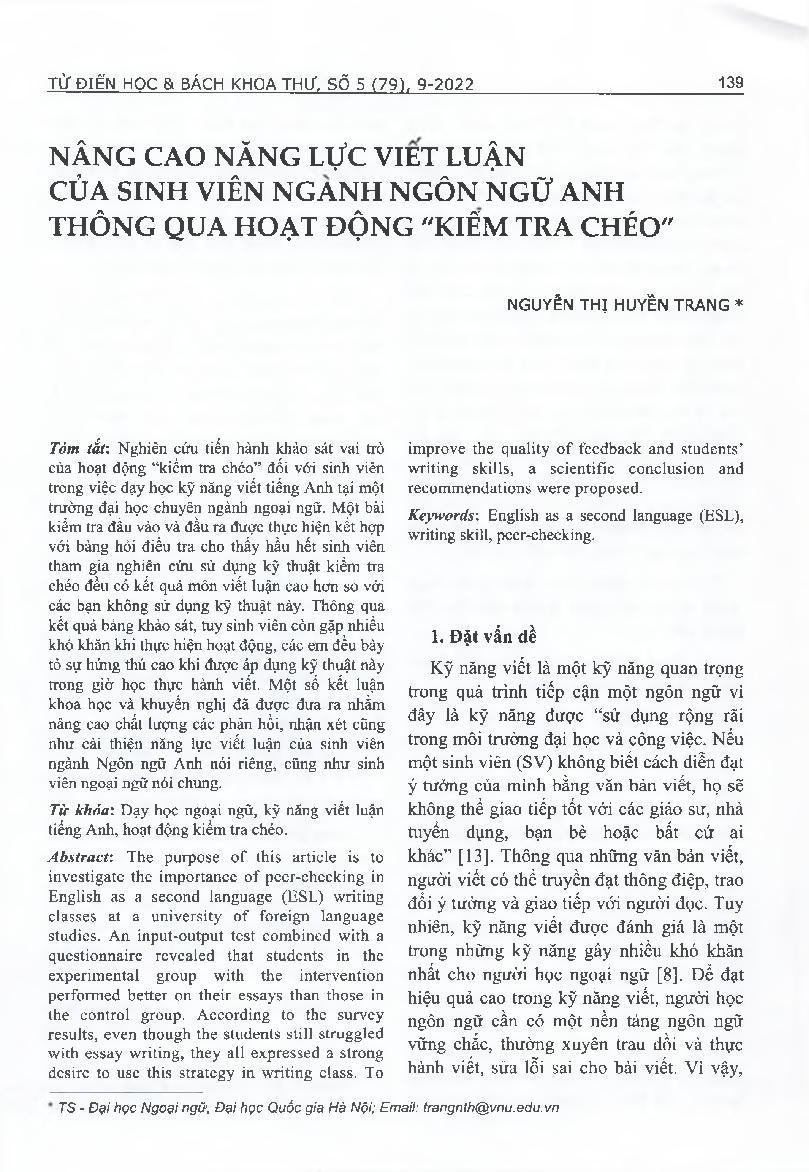 Nâng cao năng lực viết luận của sinh viên ngành ngôn ngữ Anh thông qua hoạt động "kiểm tra chéo" = Improve the writing ability of English language students through "cross-checking" activities