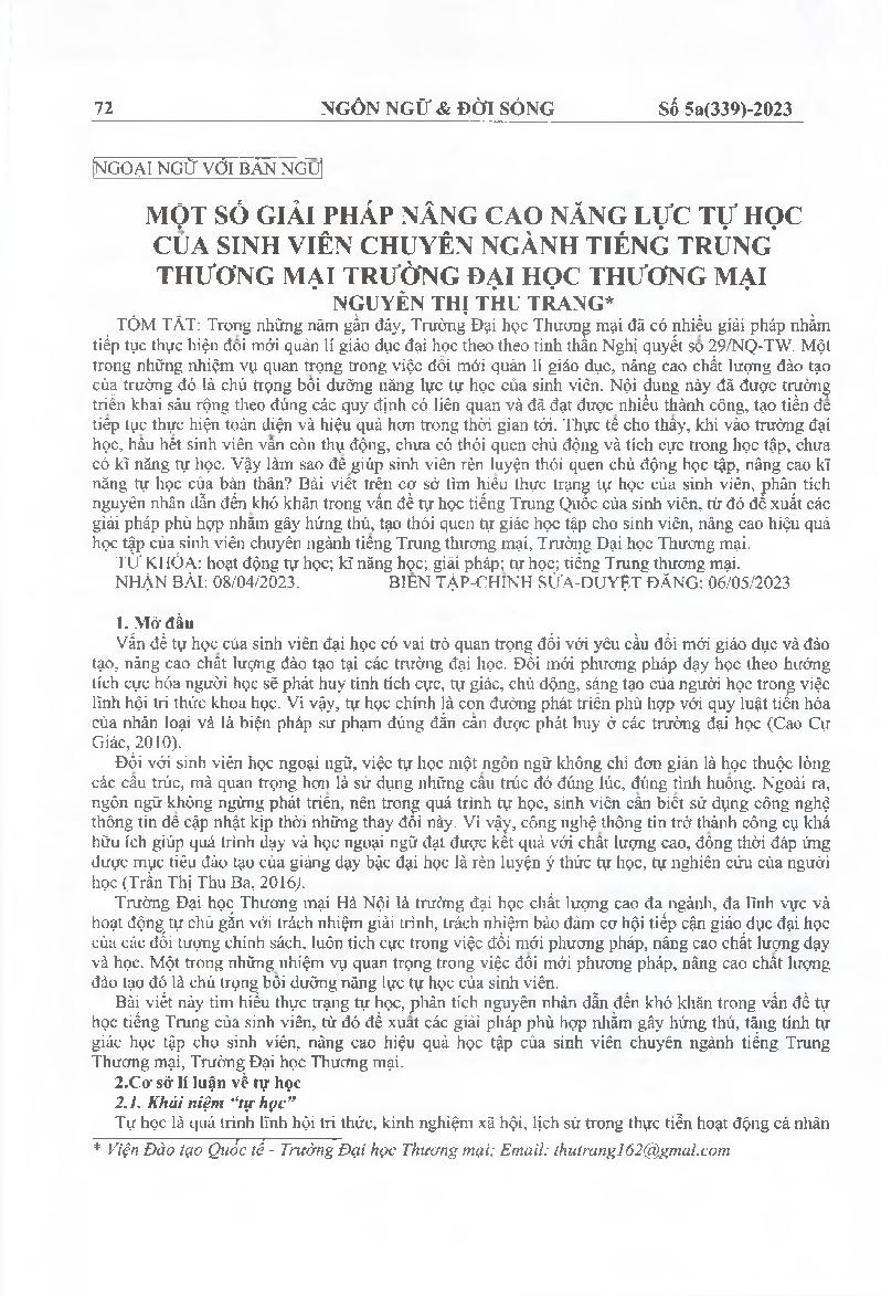 Một số giải pháp nâng cao năng lực tự học của sinh viên chuyên ngành tiếng Trung thương mại trường Đại học Thương mại = Some solutions to improve self-study capacity of students majoring in Business Chinese at the Thuong mai University