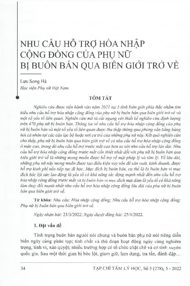 Nhu cầu hỗ trợ hòa nhập cộng đồng của phụ nữ bị buôn bán qua biên giới trở về = Community reintegration support demand of trafficked women