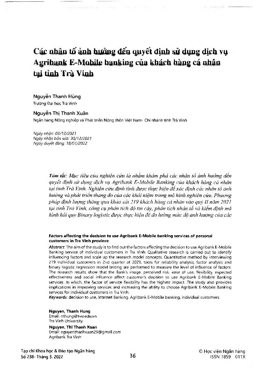 Các nhân tố ảnh hưởng đến quyết định sử dụng dịch vụ Agribank E-Mobile banking của khách hàng cá nhân tại tỉnh Trà Vinh = Factors affecting the decision to use Agribank E-Mobile banking services of personal customers in Tra Vinh province