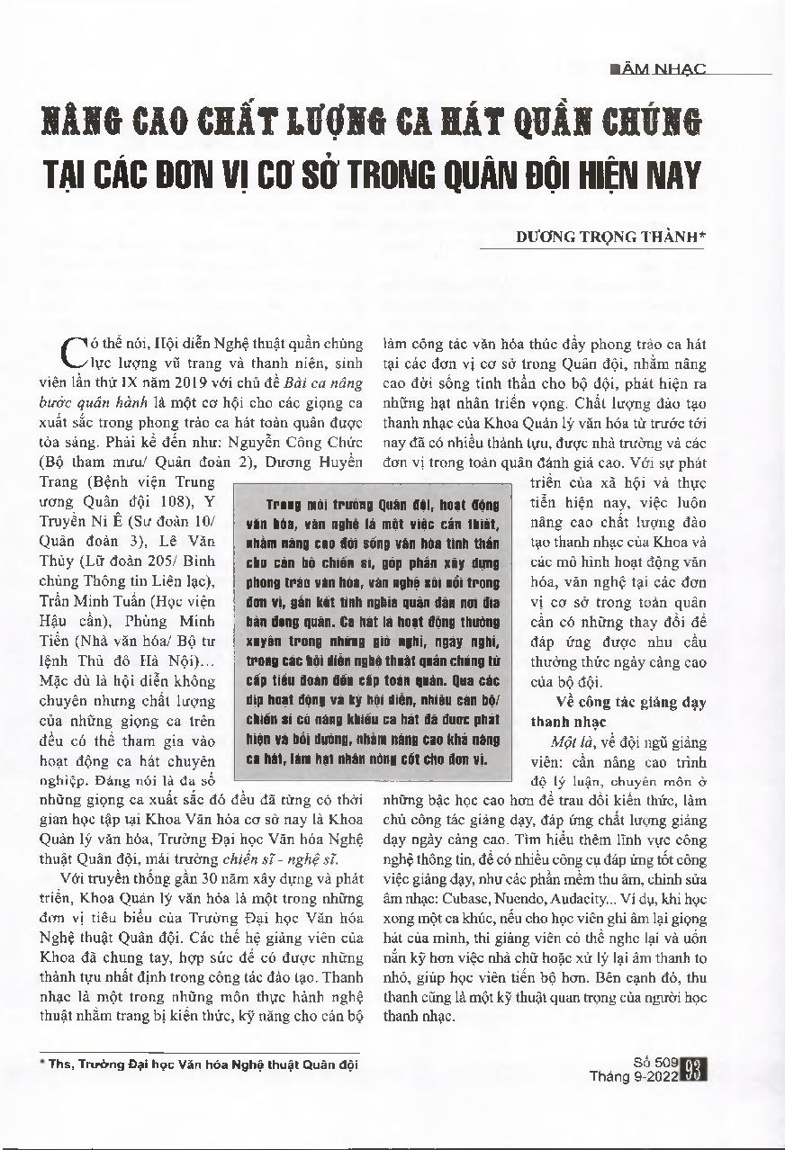 Nâng cao chất lượng ca hát quần chúng tại các đơn vị cơ sở trong quân đội hiện nay
