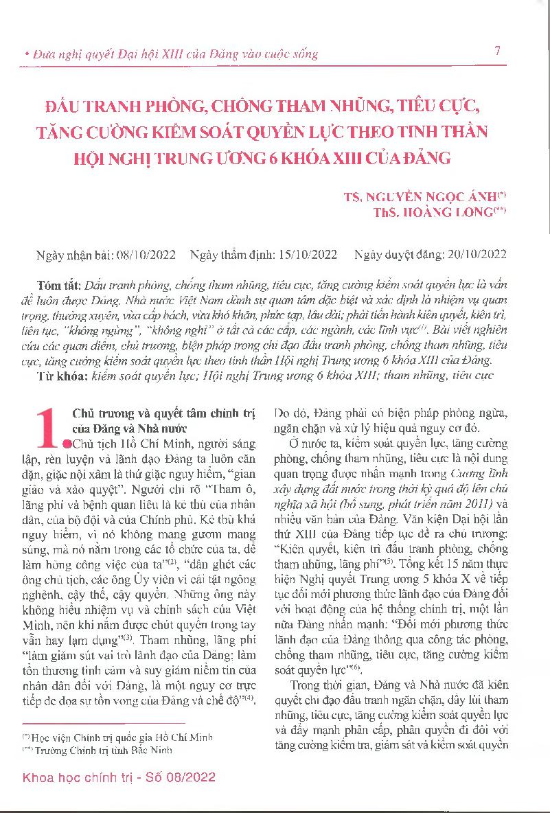 Đấu tranh phòng, chống tham nhũng, tiêu cực, tăng cường kiểm soát quyền lực theo tinh thần hội nghị trung ương 6 khóa XIII của Đảng = Fighting against corruption and negativity as well as strengthening control of power in the spirit of the resolution of t