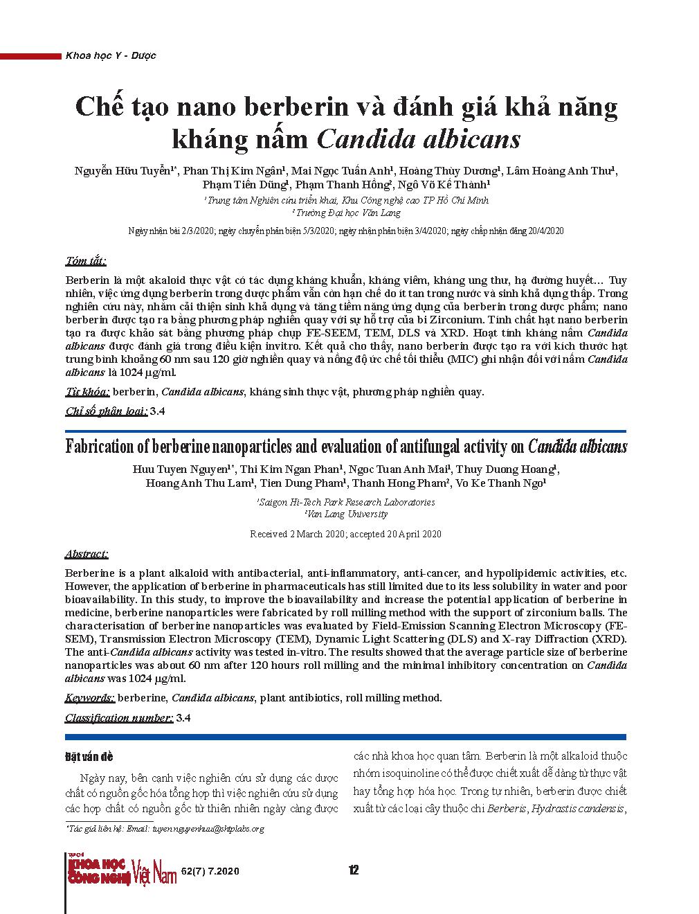 Chế tạo nano berberin và đánh giá khả năng kháng nấm Candida albicans. = Fabrication of berberine nanoparticles and evaluation of antifungal activity on Candida albicans
