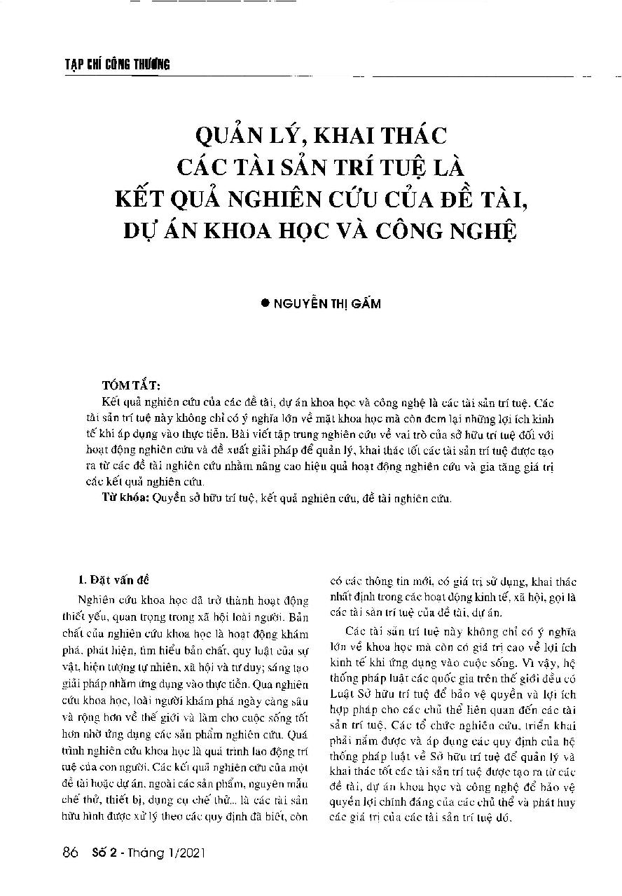 Quản lý, khai thác các tài sản trí tuệ là kết quả nghiên cứu của đề tài, dự án khoa học và công nghệ = The management of intellectual properties which are results of scientific and technological projects & researches