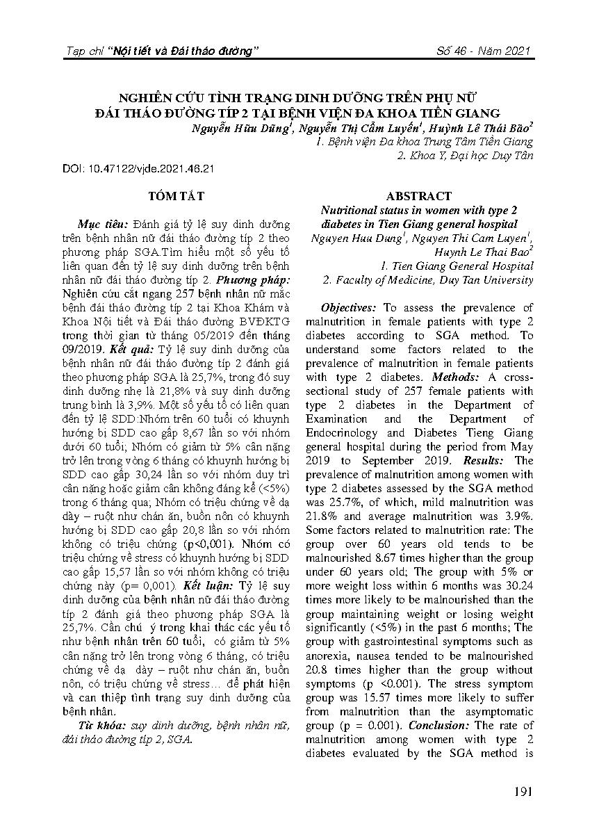 Nghiên cứu tình trạng dinh dưỡng trên phụ nữ đái tháo đường týp 2 tại Bệnh viện Đa khoa Tiền Giang = Nutritional status in women with type 2 diabetes in Tien Giang general hospital