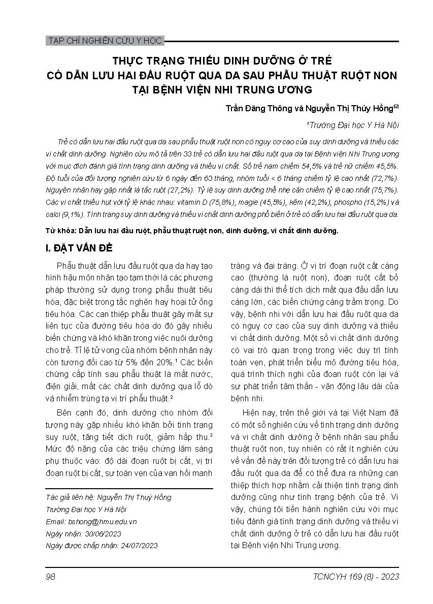 Thực trạng thiếu dinh dưỡng ở trẻ có dẫn lưu hai đầu ruột qua da sau phẫu thuật ruột non tại bệnh viện Nhi Trung ương = Nutritional and micronutrient deficiencies status in children with double enterostomy of small bowel at the National Children's hospita