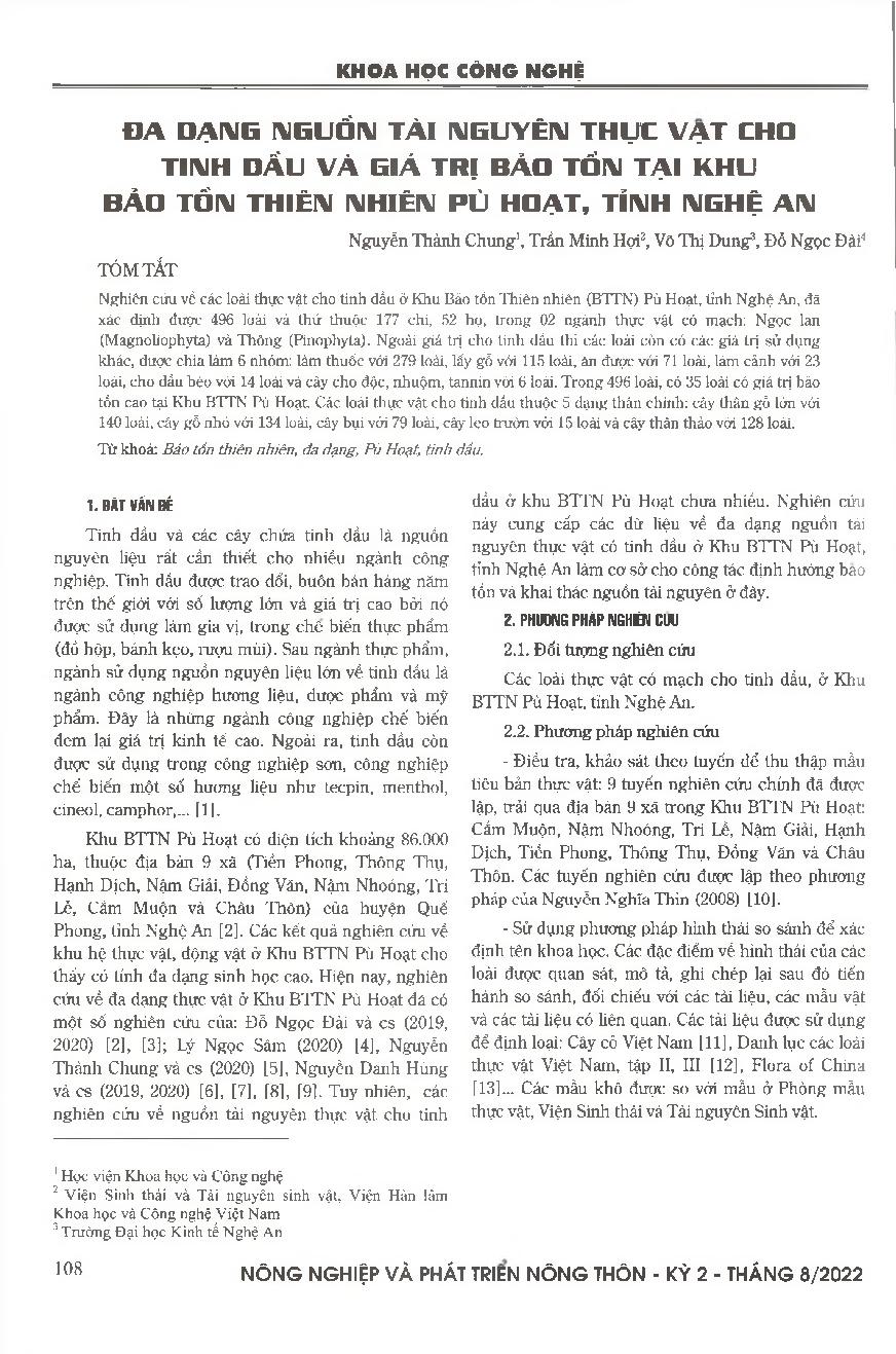 Đa dạng nguồn tài nguyên thực vật cho tinh dầu và giá trị bảo tồn tại Khu Bảo tồn Thiên nhiên Pù Hoạt, tỉnh Nghệ An = The diversity of essential oil plant resources and the conservation values in Pu Hoat Nature Reserve, Nghe An province