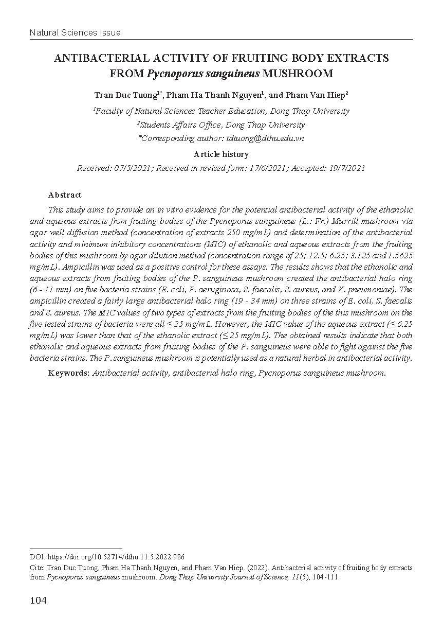 Hoạt tính kháng khuẩn của cao chiết quả thể nấm vân chi đỏ (Pycnoporus sanguineus) = Antibacterial activity of fruiting body extracts from Pycnoporus sanguineus mushroom