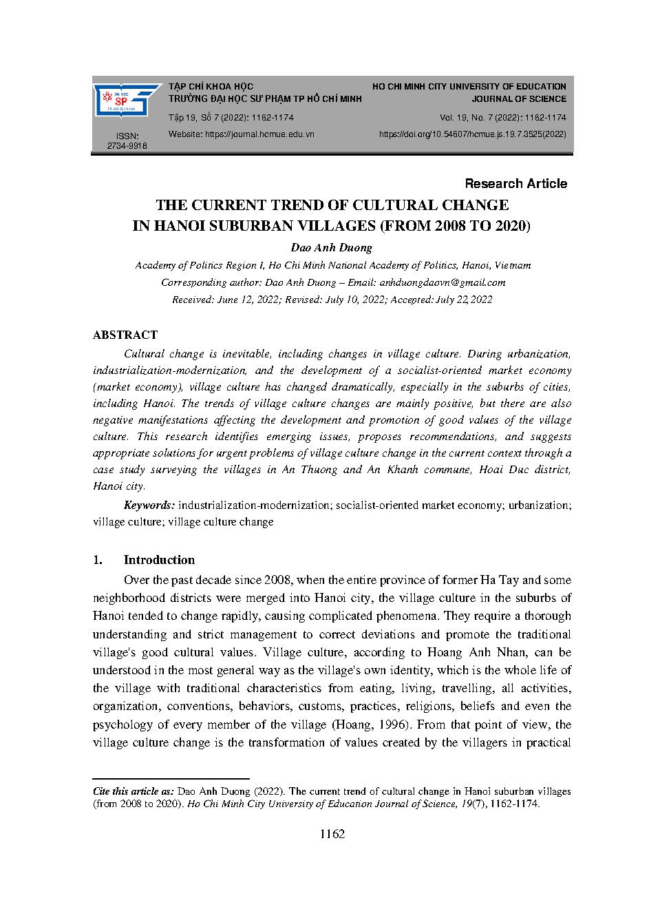 Xu hướng biến đổi văn hóa làng ở ngoại thành Hà Nội hiện nay (2008-2020) = The current trend of cultural change in hanoi suburban villages (from 2008 to 2020)