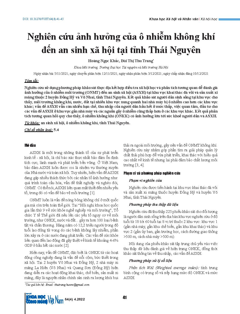 Nghiên cứu ảnh hưởng của ô nhiễm không khí đến an sinh xã hội tại tỉnh Thái Nguyên = Research on the impact of air pollution on social security in Thai Nguyen province