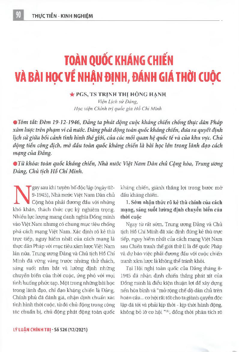 Toàn quốc kháng chiến và bài học về nhận định, đánh giá thời cuộc = National resistance war - a lesson on discerning and assessing the times