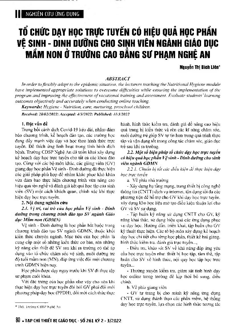Tổ chức dạy học trực tuyến có hiệu quả học phần Vệ sinh - dinh dưỡng cho sinh viên ngành Giáo dục mầm non ở Trường Cao đẳng Sư phạm Nghệ An = Effectively organize online teaching of hygiene - nutrition course for students majoring in preschool education a