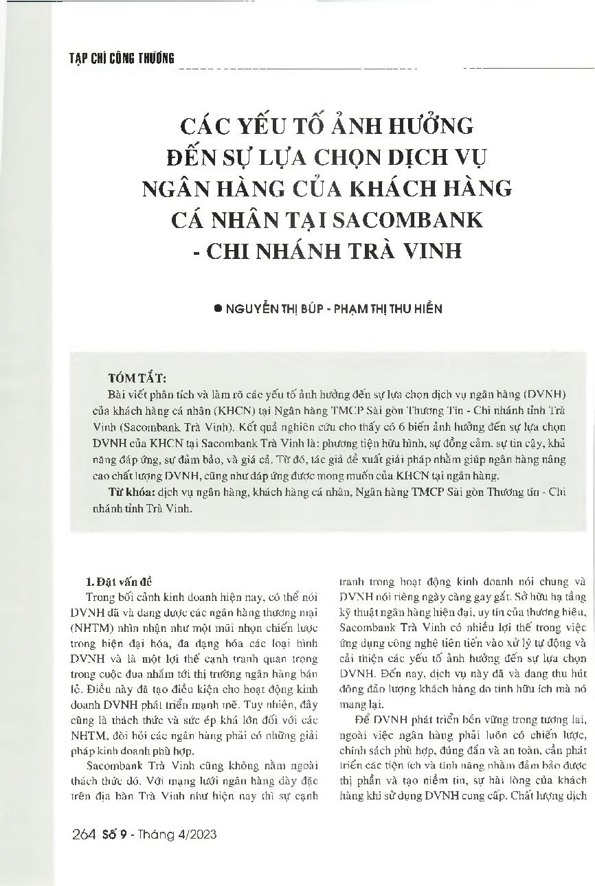 Các yếu tố ảnh hưởng đến sự lựa chọn dịch vụ ngân hàng của khách hàng cá nhân tại Sacombank - Chi nhánh Trà Vinh
