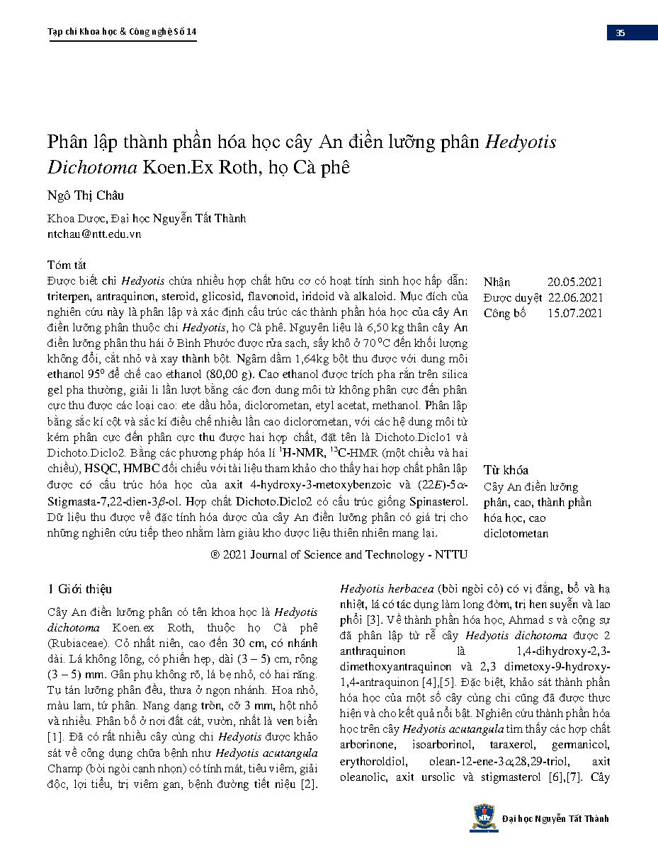 Phân lập thành phần hóa học cây An điền lưỡng phân Hedyotis Dichotoma Koen.Ex Roth, họ Cà phê = Isolation of Chemical Composition from Hedyotis Dichotoma Koen.Ex Roth, Rubiaceae