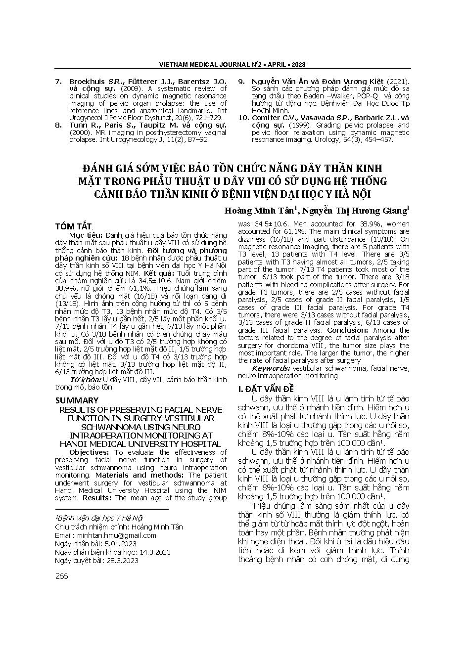 Đánh giá sớm việc bảo tồn chức năng dây thần kinh mặt trong phẫu thuật u dây VIII có sử dụng hệ thống cảnh báo thần kinh ở Bệnh viện Đại học Y Hà Nội = Results of preserving facial nerve function in surgery vestibular schwannoma using neuro intraoperative