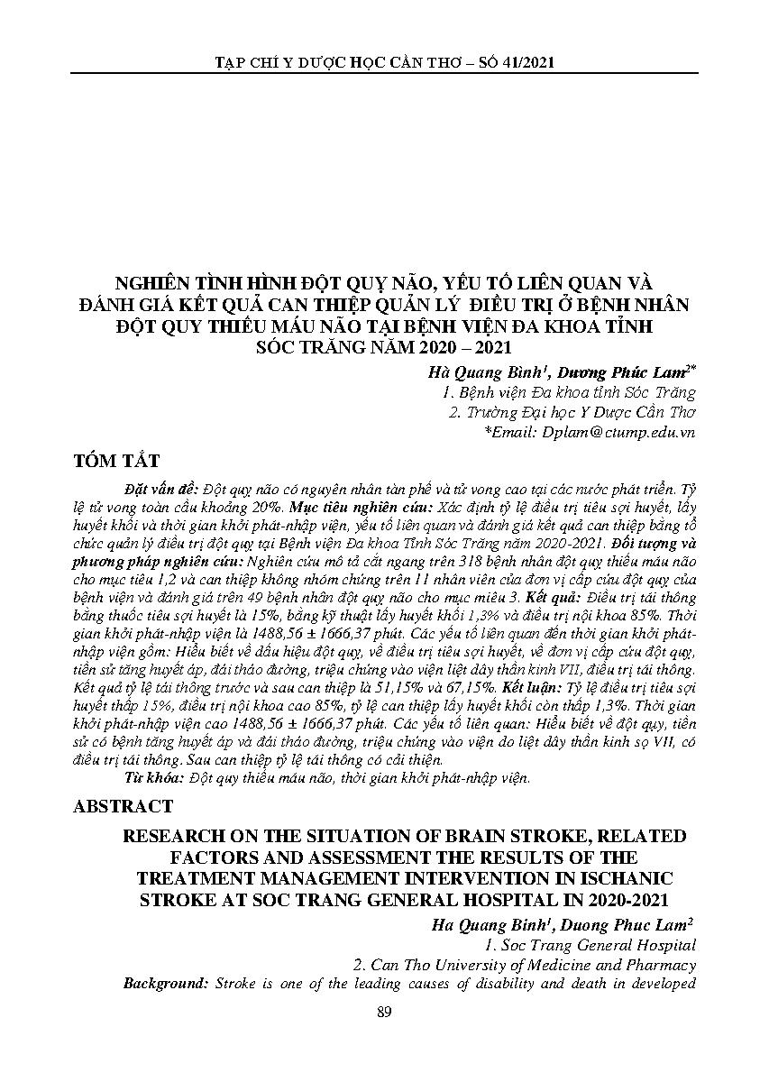 Nghiên tình hình đột quỵ não, yếu tố liên quan và đánh giá kết quả can thiệp quản lý điều trị ở bệnh nhân đột quy thiếu máu não tại bệnh viện đa khoa tỉnh Sóc Trăng năm 2020 – 2021 = RESEARCH ON THE SITUATION OF BRAIN STROKE, RELATED FACTORS AND ASSESSMENT THE RESULTS OF THE TREATMENT MANAGEMENT INTERVENTION IN ISCHANIC STROKE AT SOC TRANG GENERAL HOSPITAL IN 2020-2021