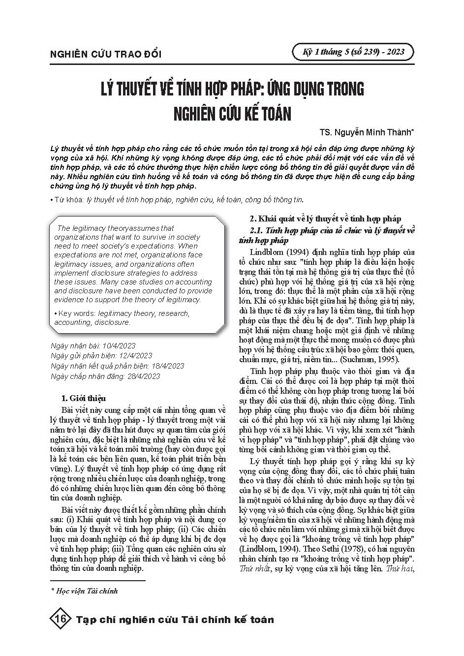 Lý thuyết về tính hợp pháp: Ứng dụng trong nghiên cứu kế toán = Theory of legitimacy: Application in accounting research
