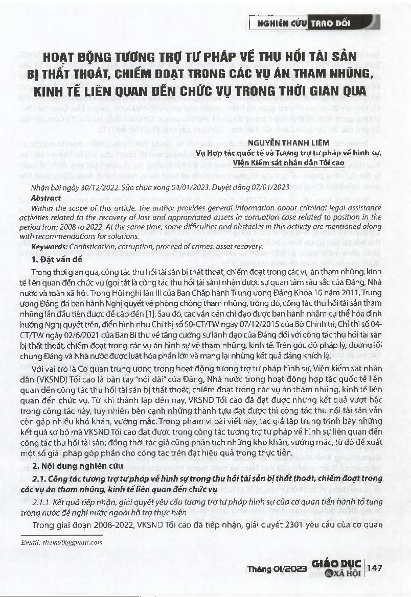 Hoạt động tương trợ tư pháp về thu hồi tài sản bị thất thoát, chiếm đoạt trong các vụ án tham nhũng, kinh tế liên quan đến chức vụ trong thời gian qua = Criminal legal assistance activities related to recovery of lost and appropriated assets in criminal c
