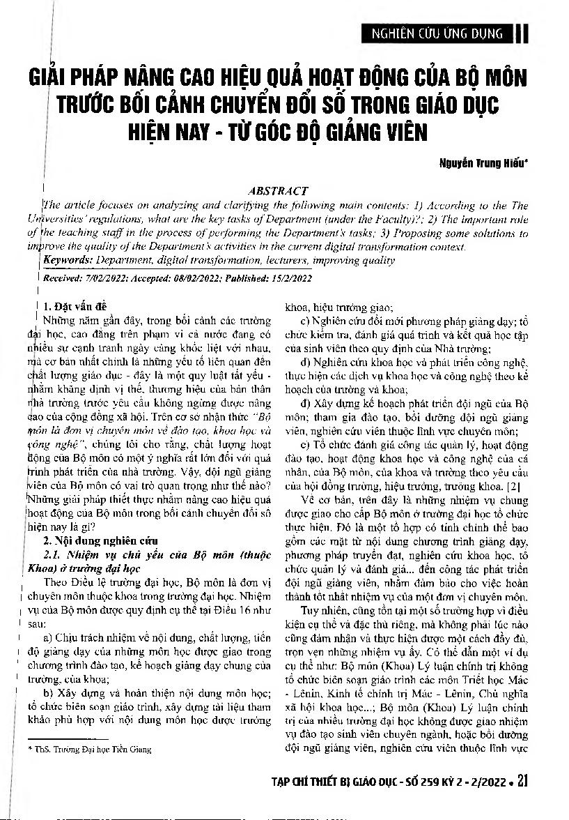 Giải pháp nâng cao hiệu quả hoạt động của bộ môn trước bối cảnh chuyển đổi số trong giáo dục hiện nay - từ góc độ giảng viên = Solutions of improving the performance of the subject in the context of digital transformation in education today - from the per