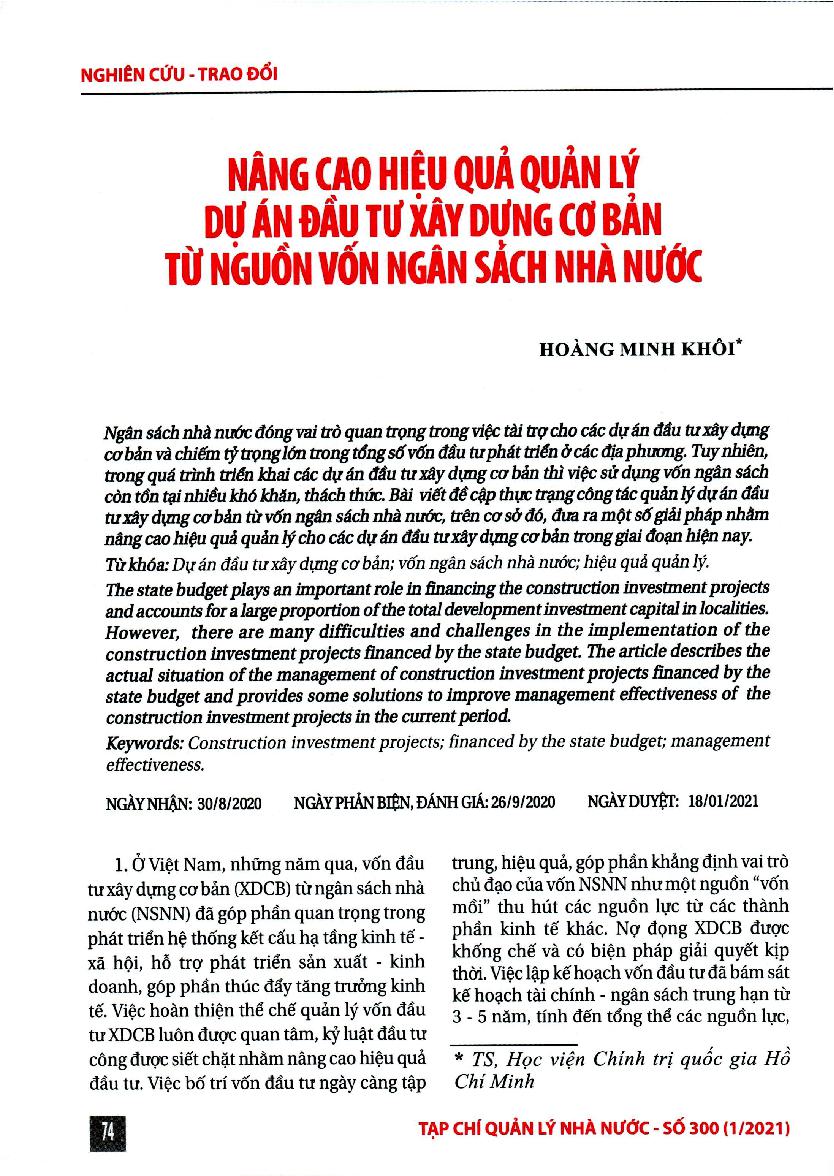 Nâng cao hiệu quả quản lý dự án đầu tư xây dựng cơ bản từ nguồn vốn ngân sách nhà nước = Improve the management efficiency of capital construction investment projects from the state budget