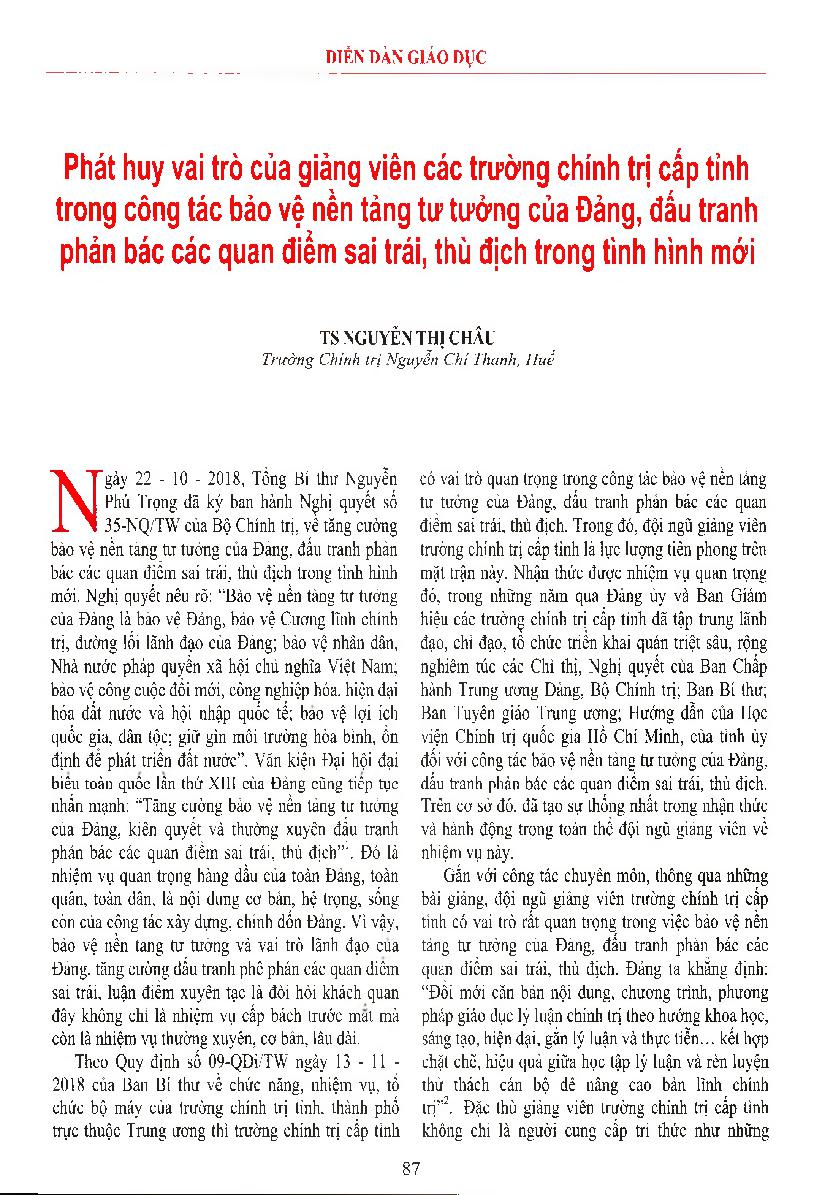 Phát huy vai trò của giảng viên các trường chính trị cấp tỉnh trong công tác bảo vệ nền tảng tư tưởng của Đảng, đấu tranh phản bác các quan điểm sai trái, thù địch trong tình hình mới