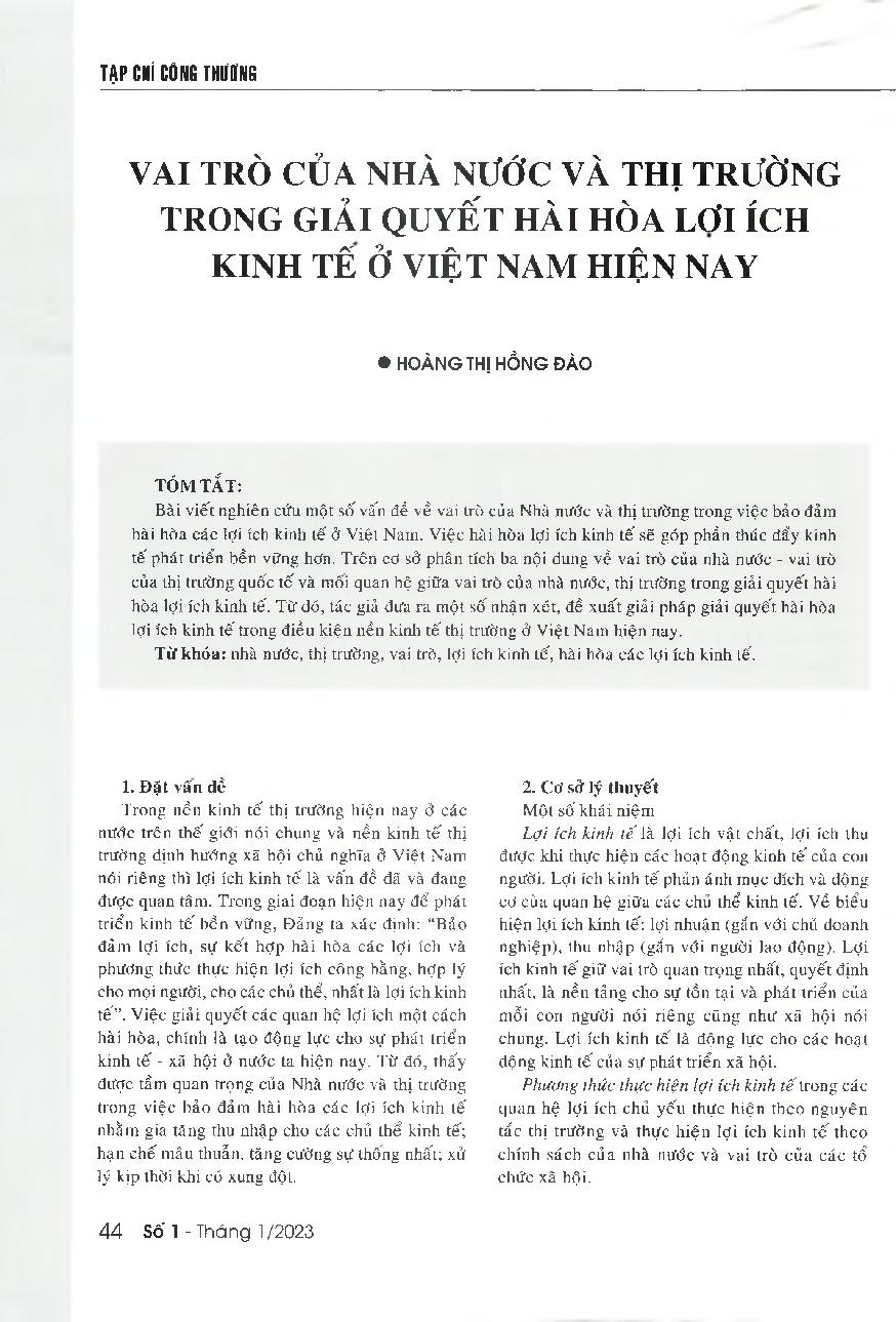 Vai trò của nhà nước và thị trường trong giải quyết hài hòa lợi ích kinh tế ở Việt Nam hiện nay = The role of the State and the market in the harmonization of economic benefits in Vietnam