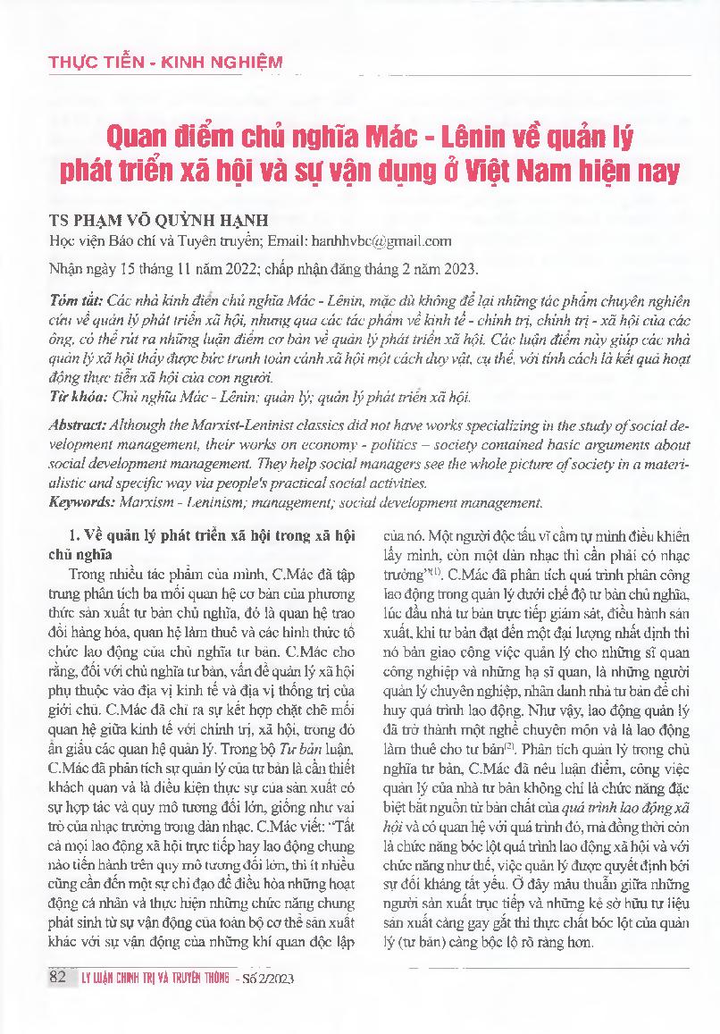 Quan điểm chủ nghĩa Mác - Lênin về quản lý phát triển xã hội và sụ vận dụng ở Việt Nam hiện nay = Marxist - Leninist viewpoints on social development management and application in Vietnam today