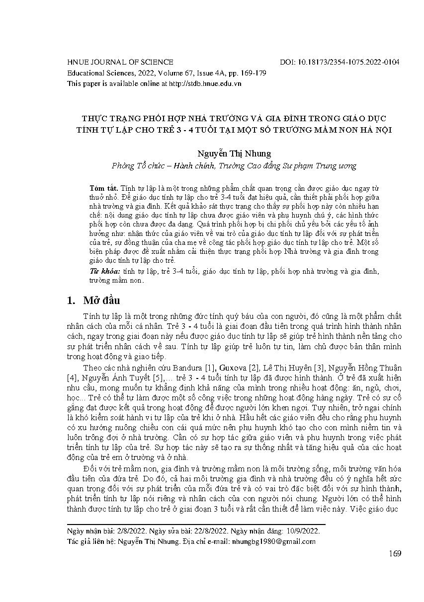 Thực trạng phối hợp nhà trường và gia đình trong giáo dục tính tự lập cho trẻ 3 - 4 tuổi tại một số trường mầm non Hà Nội = The reality of school and family coordination in the education of independence for 3-4-year-olds at some kindergartens in Hanoi