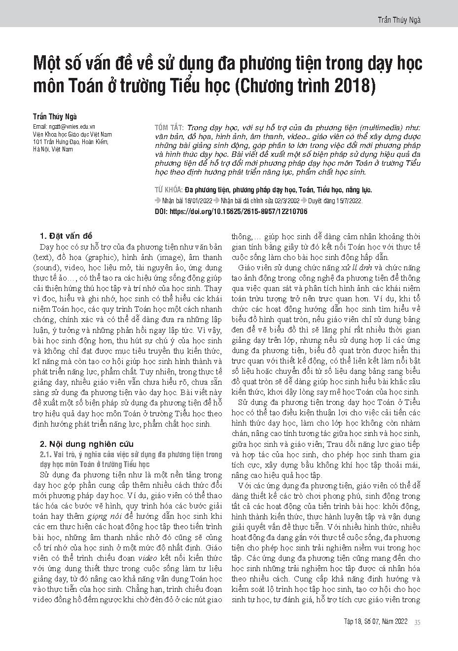 Một số vấn đề về sử dụng đa phương tiện trong dạy học môn Toán ở trường Tiểu học (Chương trình 2018) = Some issues about the usage of multimedia in teaching primary mathematics (under the curriculum 2018)
