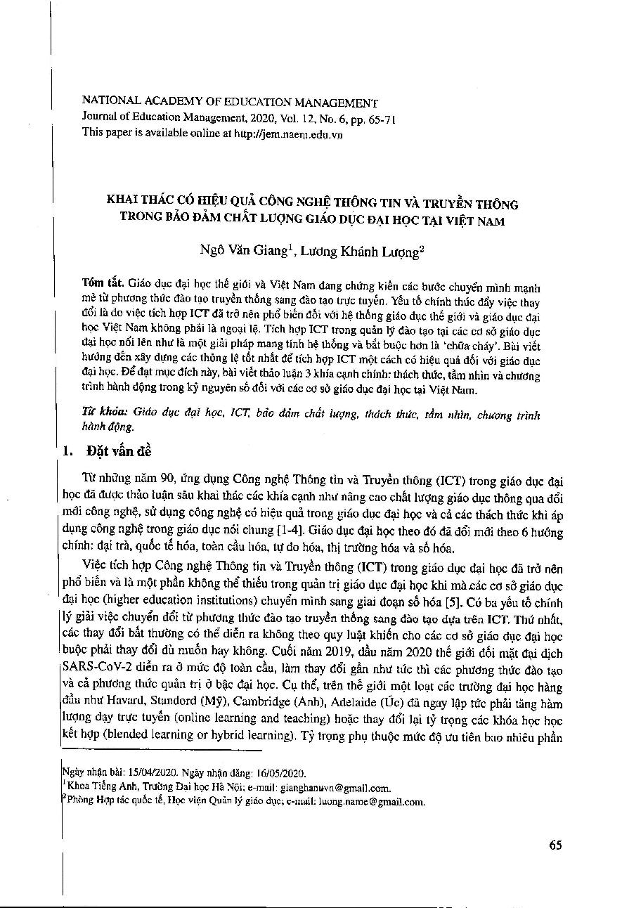 Khai thác có hiệu quả công nghệ thông tin và truyền thông trong bảo đảm chất lượng giáo dục đại học tại Việt Nam = Making an effective use of Information and Communication Technology to acquire higher education quality assurance in Vietnam