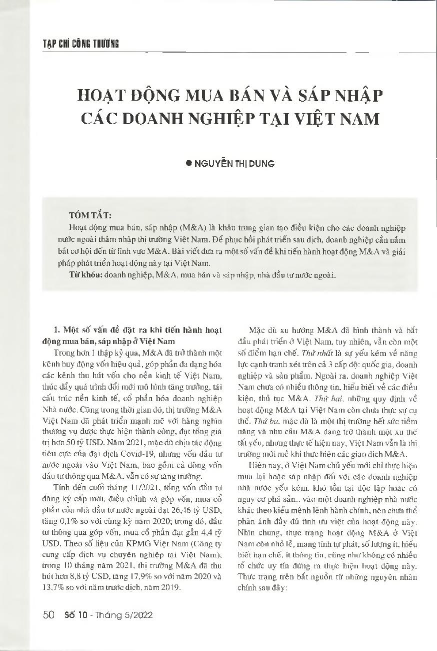 Hoạt động mua bán và sáp nhập các doanh nghiệp tại Việt Nam = Mergers and acquisitions of enterprises in Vietnam