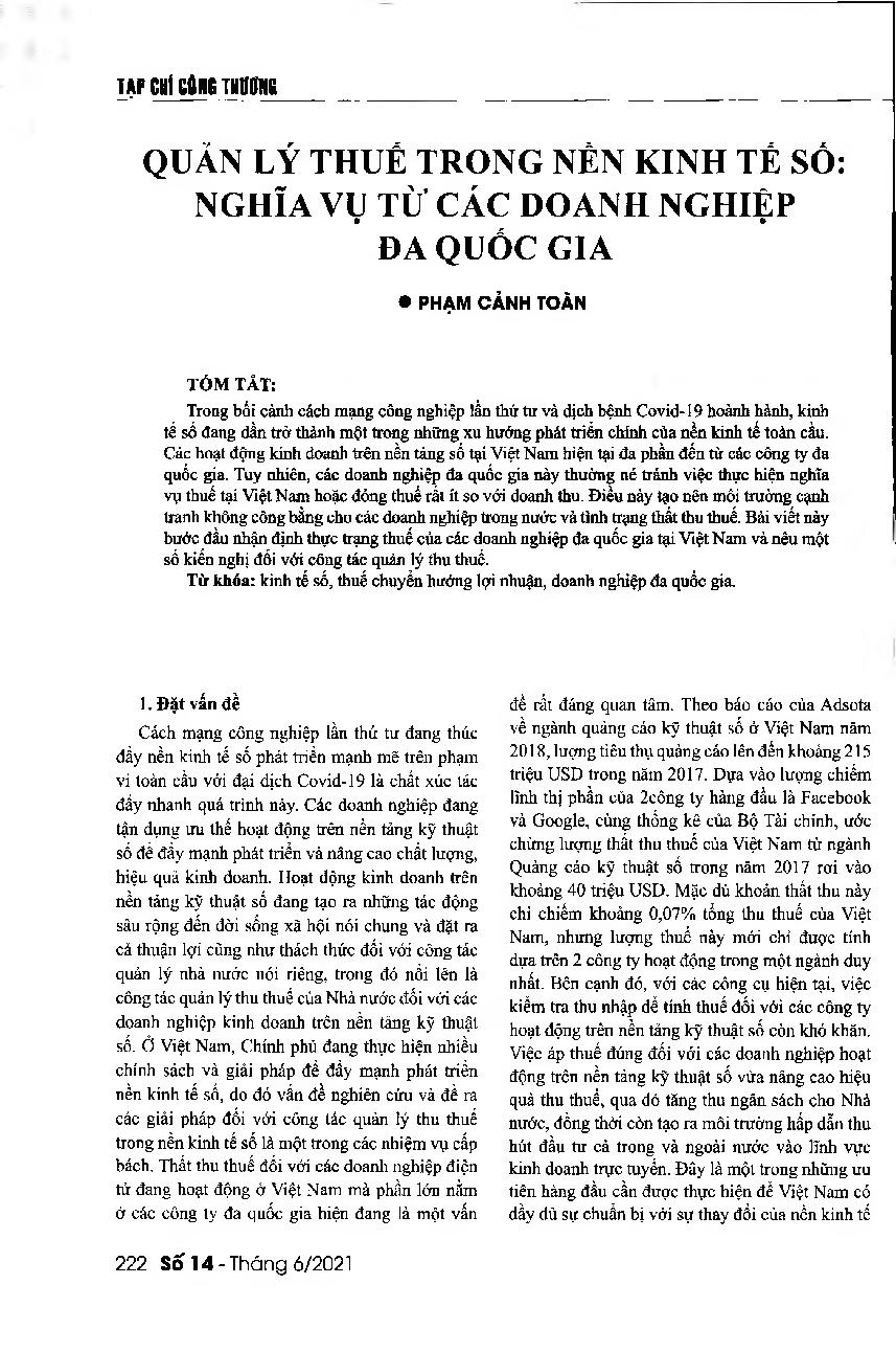 Quản lý thuế trong nền kinh tế số: Các doanh nghiệp đa quốc gia = The fulfillment of tax obligations of multinational companies in the digital economy