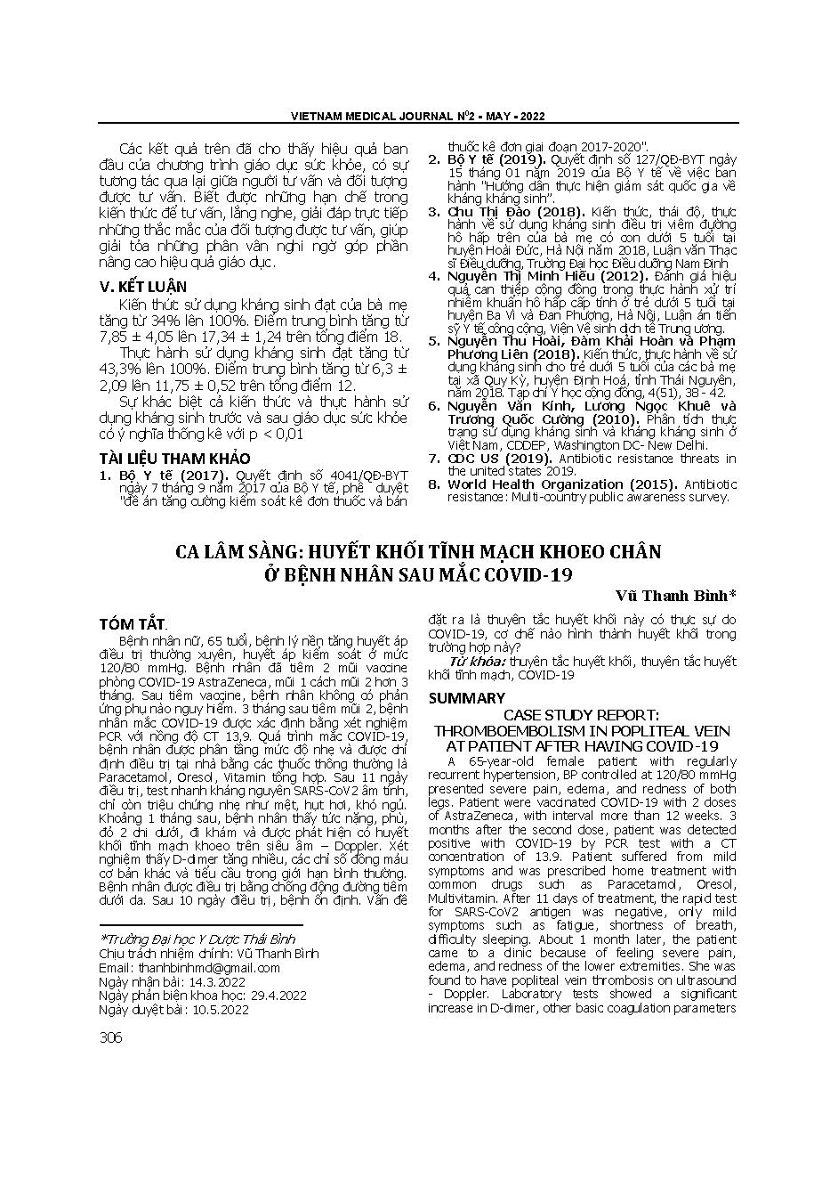 Ca lâm sàng: Huyết khối tĩnh mạch khoeo chân ở bệnh nhân sau mắc Covid-19 = Case study report: Thromboembolism in popliteal vein at patient after having Covid-19