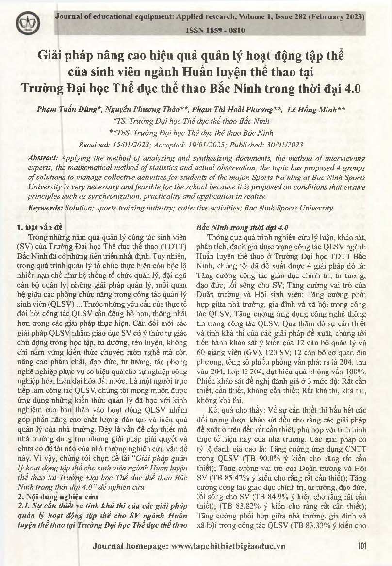 Giải pháp nâng cao hiệu quả quản lý hoạt động tập thể của sinh viên ngành Huấn luyện thể thao tại Trường Đại học Thể dục thể thao Bắc Ninh trong thời đại 4.0 = Solutions to improve the efficiency of management of team activities for sports training studen