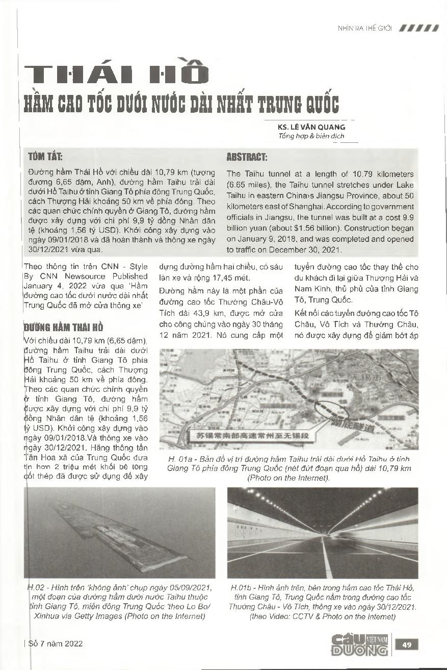 Thái Hồ - hầm cao tốc dưới nước dài nhất Trung Quốc = Taihu tunnel - China’s longest underwater highway tunnel