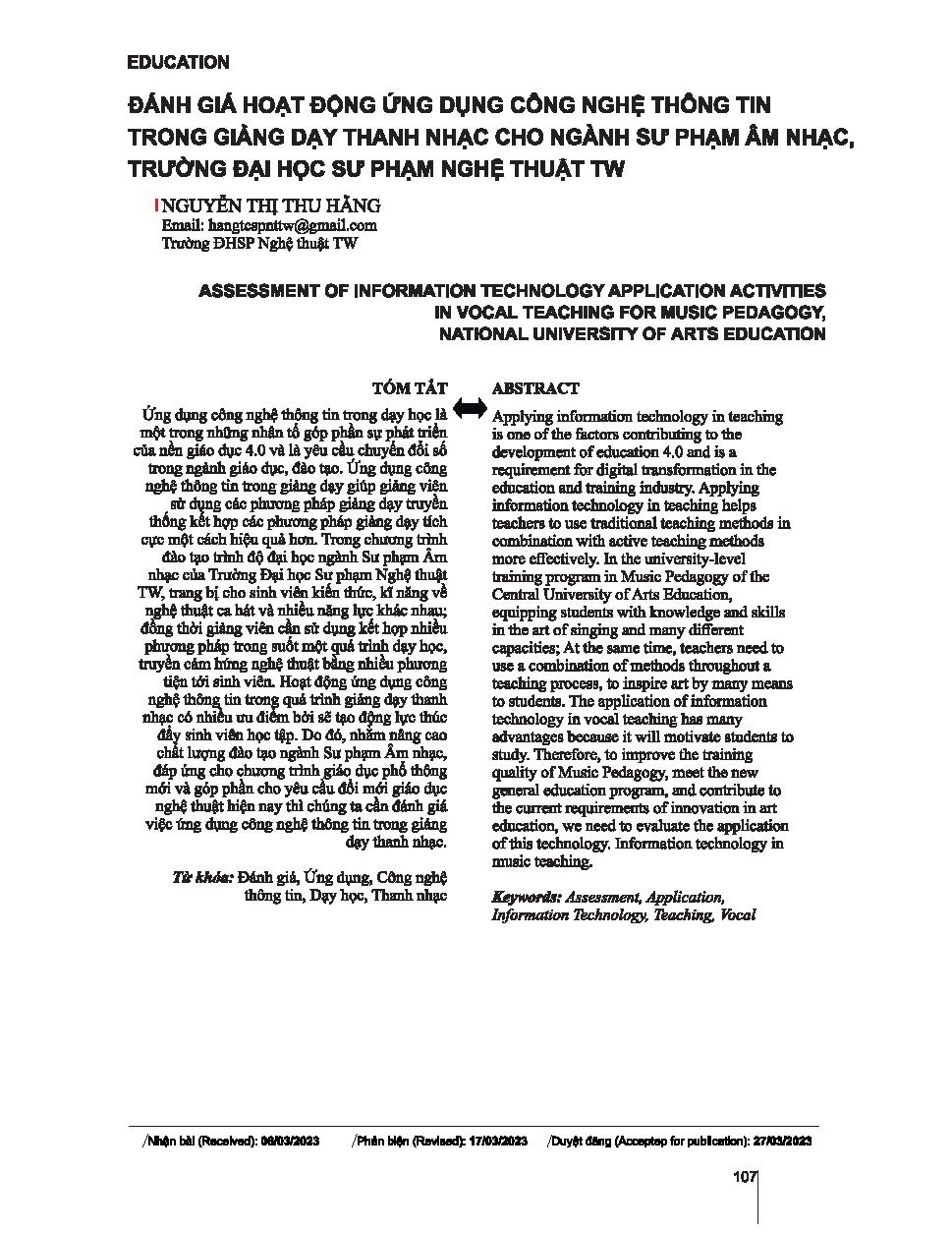 Đánh giá hoạt động ứng dụng công nghệ thông tin trong giảng dạy thanh nhạc cho ngành Sư phạm Âm nhạc, trường Đại học Sư phạm Nghệ thuật Trung ương