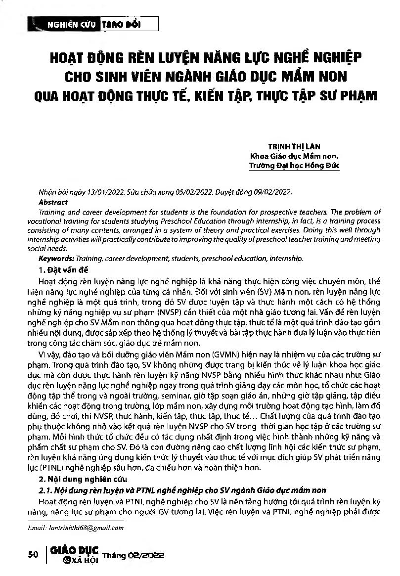 Hoạt động rèn luyện năng lực nghề nghiệp cho sinh viên ngành Giáo dục Mầm non qua hoạt động thực tế, kiến tập, thực tập sư phạm = Capacity building activities for Preschool Education students through pedagogical internship