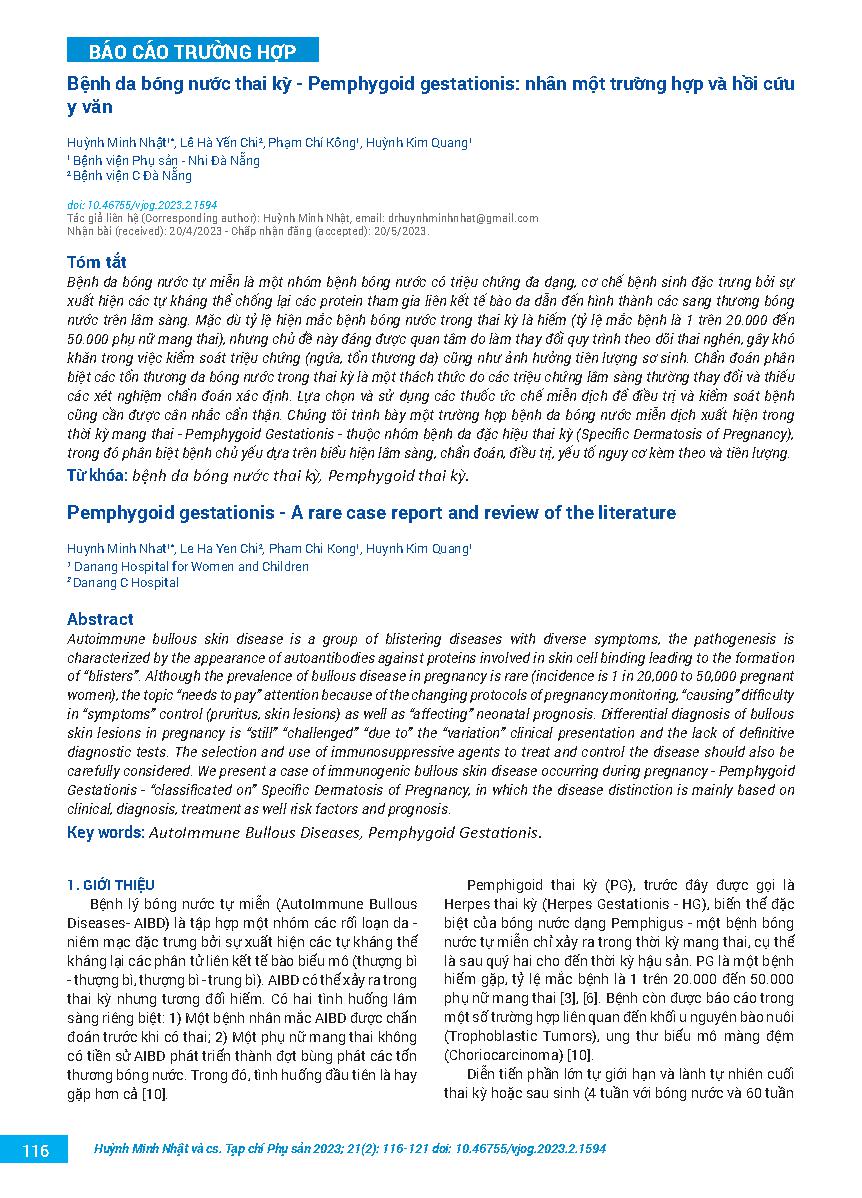 Bệnh da bóng nước thai kỳ - Pemphygoid gestationis: nhân một trường hợp và hồi cứu y văn = Pemphygoid gestationis - A rare case report and review of the literature
