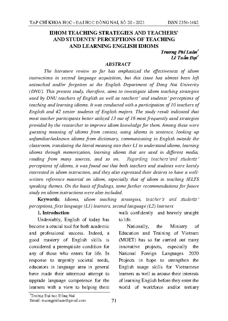 Chiến lược dạy thành ngữ và thái độ của giảng viên và sinh viên đối với việc dạy và học thành ngữ = Idiom teaching strategies and teachers’ and students’ perceptions of teaching and learning English idioms