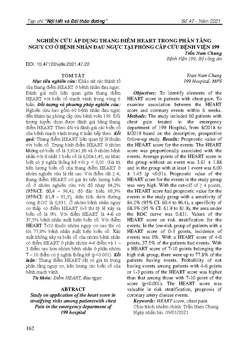 Nghiên cứu áp dụng thang điểm heart trong phân tầng nguy cơ ở bệnh nhân đau ngực tại phòng cấp cứu bệnh viện 199 = Study on application of the heart score in stratifying risks among patientswith chest Pain in the emergency department of 199 hospital